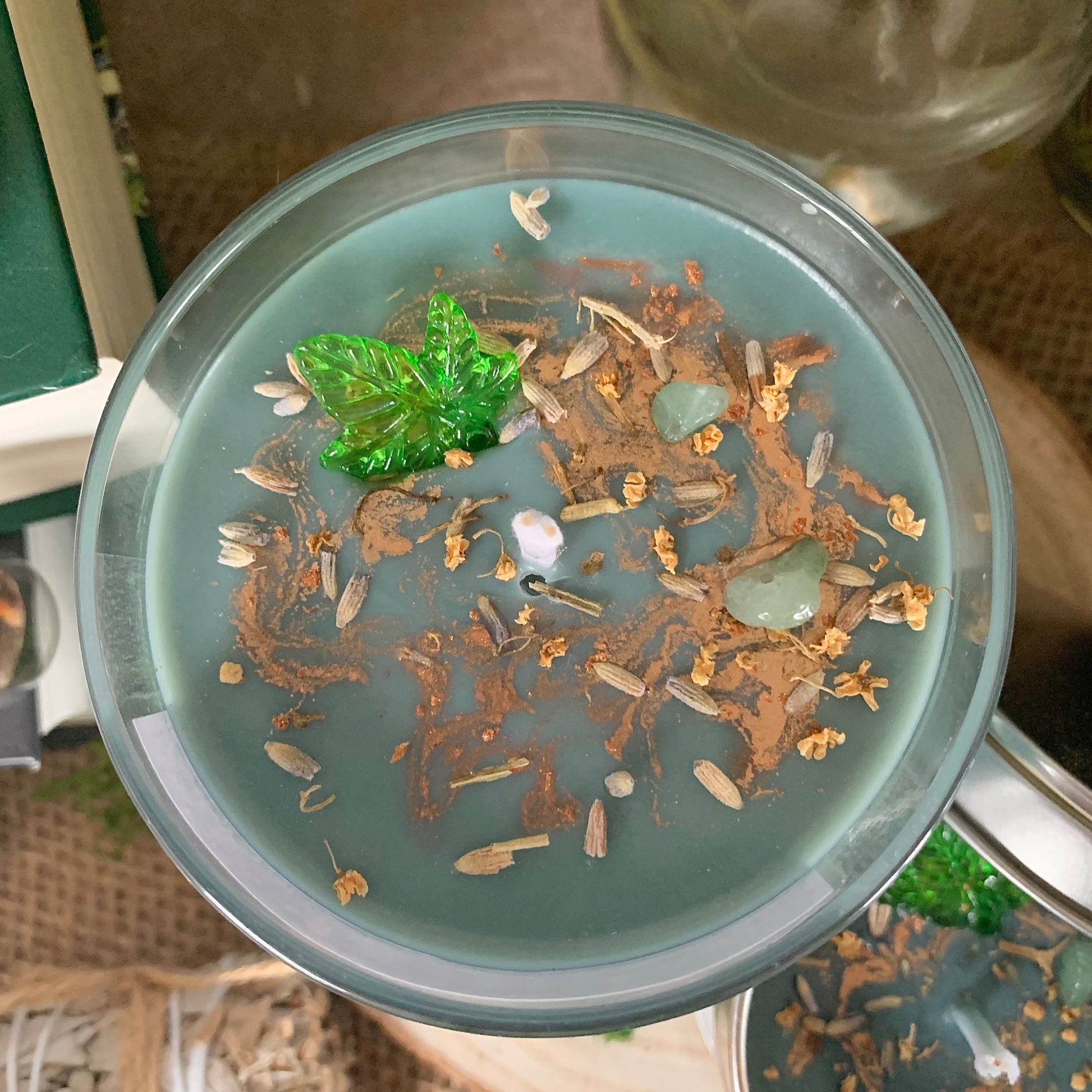 Unsere Duftkerzen werden mit getrockneten Blüten + Kräutern sowie Kristallen dekoriert. Die genutzten Gefäße können mit heißem Wasser abgekocht und danach wieder verwendet werden. Da jede Kerze von Hand gegossen wird, können die Farben leicht abweichen.